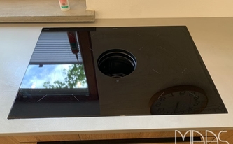 In die erste Arbeitsplatte in dem Maßen 274,00 x 64,10 cm wurde ein flächenbündiger Ausschnitt für die Spüle eingearbeitet, sowie eine Armaturbohrung darüber, rechts davon wurde das Ceranfeld flächenbündig in den Ausschnitt installiert. Daneben wurde die zweite Arbeitsplatte in den Maßen 112,90 x 60,30 cm montiert. Für die Kücheninsel wurde eine 164,10 x 91,20 cm große Arbeitsplatte hergestellt und montiert.