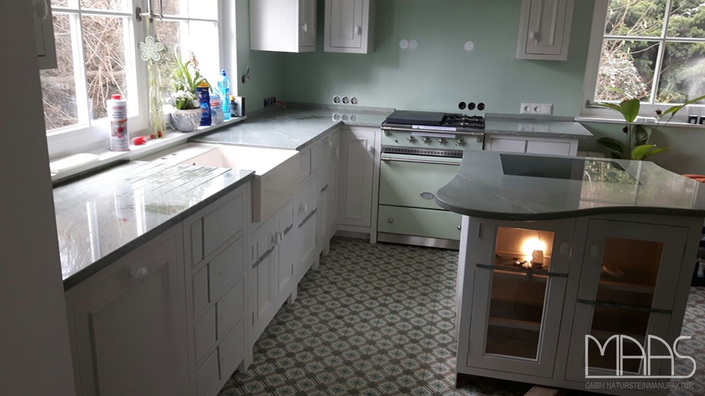 Bei diesen sechs Granit Andeer Arbeitsplatten, die in Bonn montiert wurde, ist die steifige Struktur zu erkennen. Die Arbeitsplatten sind in 3 cm Stärke und mit polierten Oberflächen angefertigt worden. Im Spülbereich wurden 7 Abtropfrillen eingefräst. Eine Platte wurde für die Kücheninsel angefertigt. In dieser Arbeitsplatte wurde ein flächenbündiger Ausschnitt eingearbeitet, sowie zwei Bogenschnitte gesägt und poliert. Die Maße der 6 Arbeitsplatten: 126 x 60,5 cm, 173,3 x 90,6 cm, 68,8 x 65,1 cm, 119,7 x 119,4 cm und 59,6 x 41,9 cm.