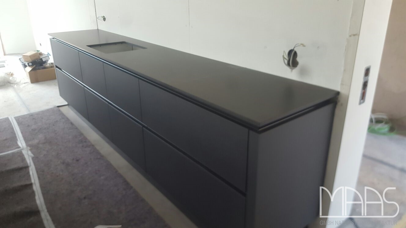 Gerade aus diesem Grund haben sich unsere Kunden aus Karlsruhe für die Caesarstone Arbeitsplatten aus dem Material Raven in 2 cm Stärke inkl. Kantenbearbeitung entschieden. Die Oberflächen der Küchenarbeitsplatte sind geschliffen. Es wurde ein eckiger, flächenbündiger Ausschnitt für das Ceranfeld und ein Unterbauausschnitt für die Spüle in die Caesarstone Küchenarbeitsplatte eingearbeitet.