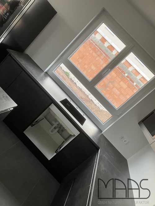 Die erste Arbeitsplatte unter dem Fenster misst 188,80 x 72,10 cm und wurde präzise mit einer Ausklinkung für das Fensterprofil angepasst. Über der Unterbauspüle wurden drei Bohrungen eingearbeitet – für Armatur, Seifenspender und eine weitere Funktion – ganz im Sinne einer durchdachten, alltagstauglichen Planung.