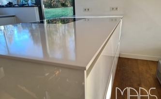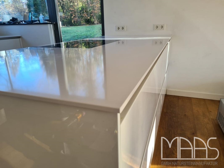 Für die Küchenzeile wurde eine maßgefertigte Arbeitsplatte aus Silestone Blanco Zeus Extreme mit polierter Oberfläche und einer Stärke von 1,2 cm installiert. Mit einer Länge von 234,10 cm und einer Breite von 63,50 cm bietet sie eine großzügige Arbeitsfläche. Eine Unterbauspüle sowie die dazugehörige Armaturbohrung wurden passgenau integriert, wodurch die Arbeitsplatte eine nahtlose Optik erhält.