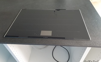 Die Granit Arbeitsplatte wurde aus dem Material Nero Assoluto Zimbabwe mit Eco Antik Oberflächen gefertigt und montiert. Die Granitplatte hat die Maße 304,20 x 122,20 x 3,00 cm. Für die Herdplatte und die Spüle wurden zwei gesägte Ausschnitt eingearbeitet.