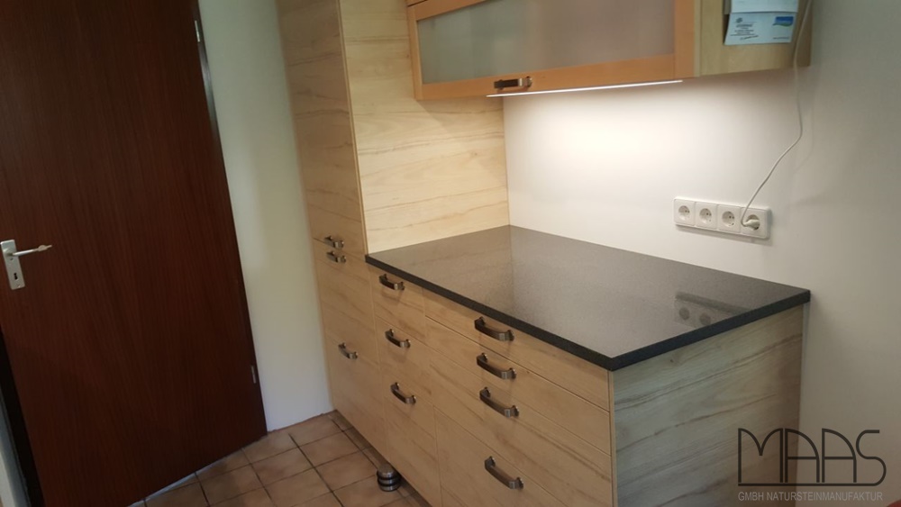 Drei Granit Arbeitsplatten aus dem Material Padang Dunkelgrau TG-36 in 3 cm Stärke wurden bestellt, gefertigt und in Stuttgart montiert. Alle Außenkanten und Oberflächen wurden komplett poliert. Die Granit Arbeitsplatten wurden in den folgenden Maßen angeertigt: