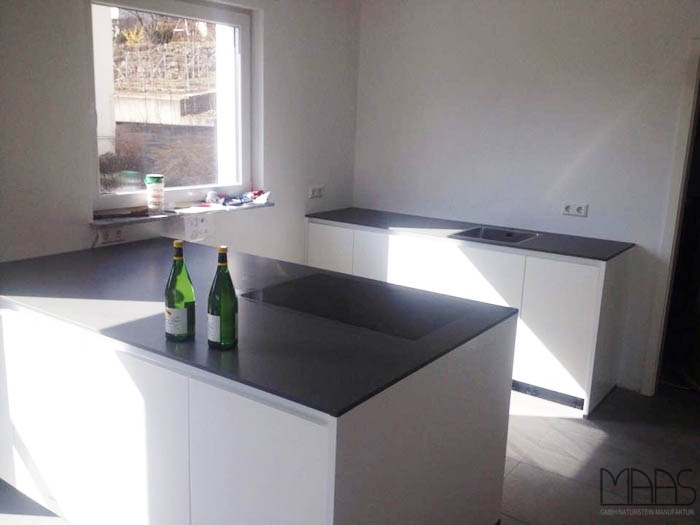 Die Caesarstone Arbeitsplatten sind in 1,2 cm Stärke inkl. Kantenbearbeitung. Die Oberfläche der Küchenarbeitsplatte ist geschliffen. Es wurde ein flächenbündiger Ausschnitt für das Ceranfeld und ein gesägter Ausschnitt für die Spüle eingearbeitet.