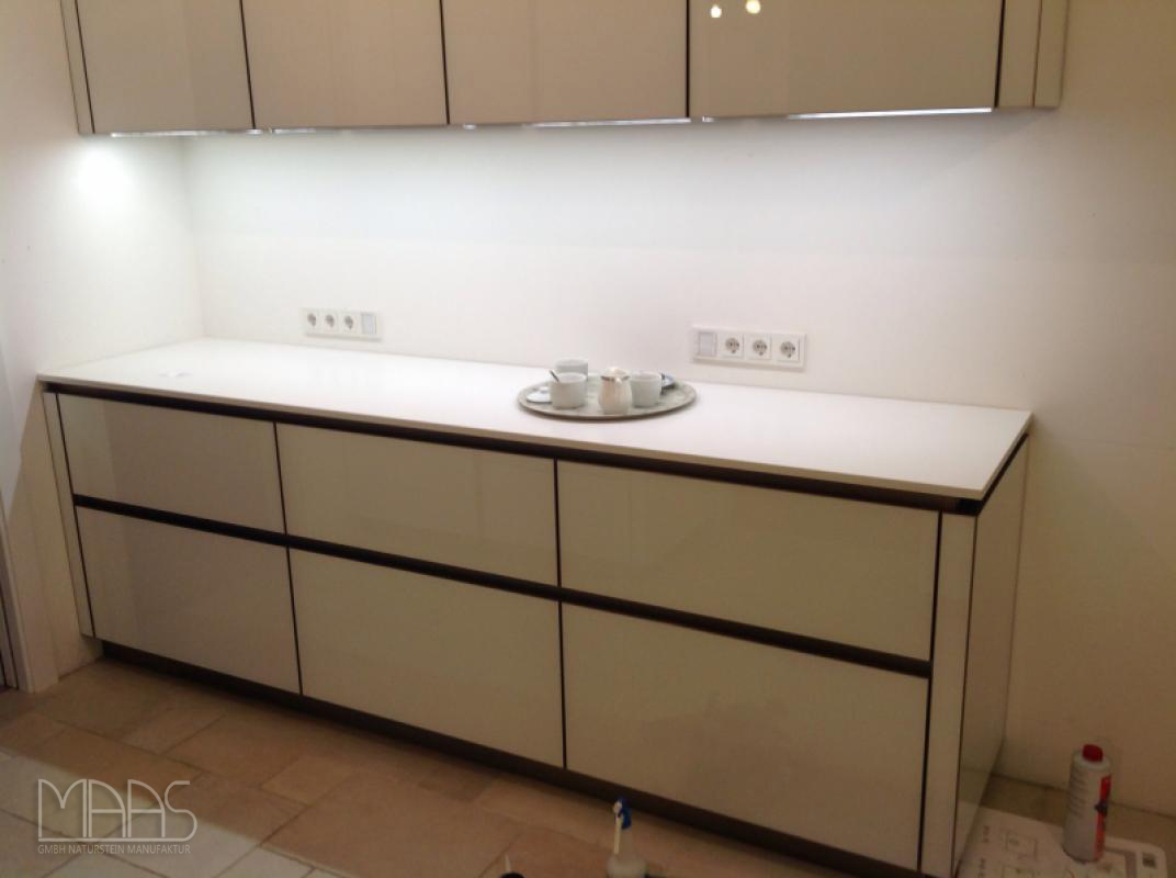 Also, die gewünschte Stärke der Caesarstone Snow Arbeitsplatten ist 2,0 cm. Die Oberflächen sind leicht gebürstet - feine Textur (relativ glatt) - Glanzgrad von seidenmatt bis leicht glänzend, auch als Viento Bearbeitung bekannt. Diese Oberflächen passen perfekt zu glänzend-weißen Küchenschränken, die dreidimensional wirken. Die Kanten sind bearbeitet. Der gesägte Ausschnitt für das Ceranfeld und ein Unterbauausschnitt für die Spüle ist eckig. Dazu haben wir auch Bohrungen für Armaturen in die Küchenarbeitsplatten eingearbeitet.